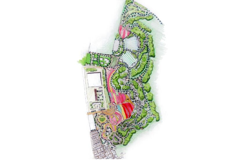 總體規劃依據地形分析形成一軸四片區五主要景觀節點空間格局,相互補充合二為一。主要包括有兩處山坳區域的商業、樂園、花卉園、果園,南側的民宿區域和北側玫園區域。